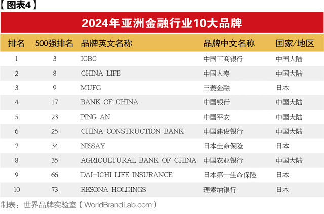 就地域划分而言,入选的亚洲金融品牌主要集中在中国、日本和韩国。在金融行业10大品牌中,有6个品牌来自中国大陆,4个品牌来自日本。三菱金融、日本生命保险、中国农业银行在总榜单的排名都经历了小幅的上升。从金融行业前20品牌的地域分布来看,金融行业前20大品牌中,有10个席位被中国大陆的金融品牌占据,而日本品牌占了7个席位。另外,韩国有2个品牌,澳大利亚有1个品牌入选金融20大品牌,这一分布情况与去年基本相同(见图表4)。