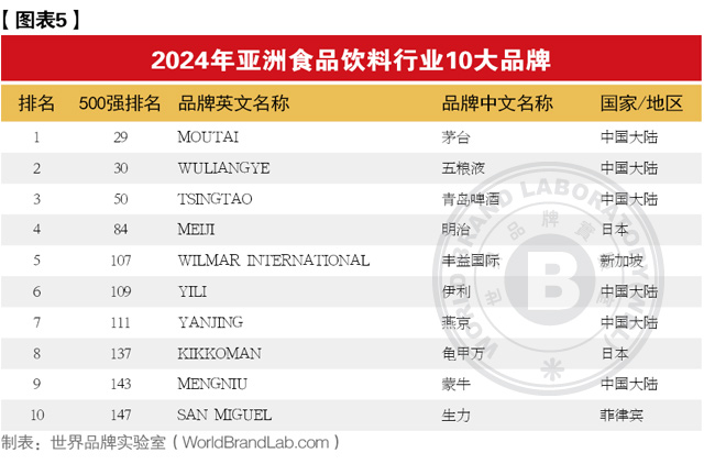 2024年《亚洲品牌500强》榜单中,共有44个食品饮料品牌入选,跟去年持平。其中中国(包括港澳台)有23个品牌入选,成为食品饮料行业入选数最多的国家。日本共有11个品牌入选,与去年持平,位列第二。在亚洲食品饮料10大品牌中,茅台比去年上升1位,以总榜单第29名位列食品饮料行业第一;五粮液位列总榜单第30名位列第二;青岛啤酒(50名)排名第三,排名前进2位。中国大陆共有6个品牌入选行业前10名,日本有2个品牌入选,新加坡和菲律宾各有1个品牌入选(见图表5)。入选总榜单百强的食品饮料品牌仅有4个,分别是中国的茅台、五粮液、青岛啤酒和日本的明治,超过六成的上榜食品饮料品牌位于200名之后。