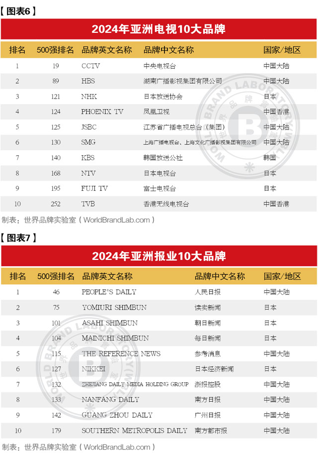 今年共有45个传媒品牌入选2024年《亚洲品牌500强》,其中,位列行业前三的品牌分别是中国的中央电视台、人民日报和日本的读卖新闻。从传媒产业的地区分布来看,中国大陆共有25个品牌入选,位居亚洲第一;日本有10个品牌入选,位列第二;中国香港有5个品牌入选,位列第三。传媒行业大部分品牌排名较为靠后,前50名中仅有中国的中央电视台和人民日报两个品牌;前100名中,传媒行业也仅有4个品牌入选(见图表6、图表7)。