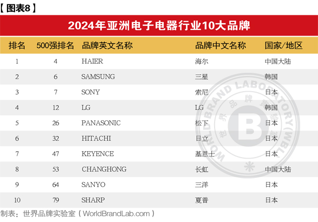 值得注意的是,日本虽然仍然占据了该行业的大部分席位,但其领先地位正逐渐受到挑战。全球技术转移和创新的加速,正使得其他国家的电子品牌快速崛起。相比之下,中国品牌在亚太地区的影响力不断扩大,市场份额也在逐步增加,中国在电子电器领域的国际竞争力持续提升。韩国品牌虽然仅有3个入选,但其在全球市场的定位较为突出,尤其在行业排名中,韩国品牌表现优异,凸显了其在技术创新和市场营销上的竞争优势。(见图表8)
