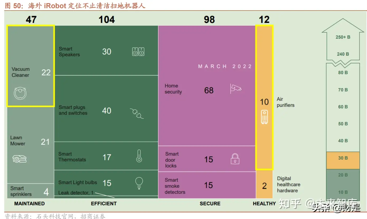 中长期来看,关于石头科技的外延场景布局思考,我们可以从海外 iRobot 的发展战略管中窥豹。2021 年 11 月 iRobot 花费 7200 美元收购 Aeris 进入空气净化器领域,未来的产品规划涉及割草机器人和洒水器(扫地机算法可以 沿用至户外)、智能家居(音箱/插座开关/体温计/灯泡/泄露检测器)、智能安防(摄像头/门锁/烟雾探测器)、健康 硬件(空气净化器/健康照护类产品)四大类。我们认为石头过去积累的算法优势可以最先在户外割草机产品上得到 复用,目前全球割草机器人行业规模 210 亿美元,基本与扫地机器人 220 亿美元相当,潜在市场空间足够中长期发 展。