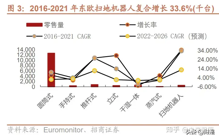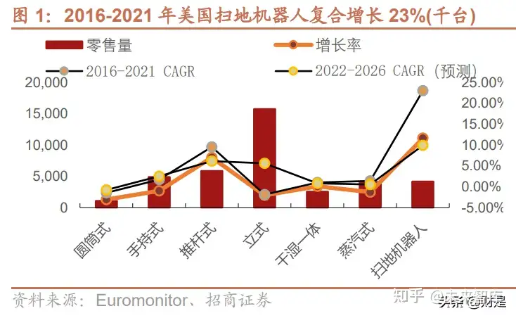 美国、日本、西欧、东欧扫地机器人增长强劲,远超其他吸尘器品类。美国扫地机器人 2016-2021 年复合增长率为 23%,西欧扫地机器人 2016-2021 年复合增长率为 18.8%,东欧扫地机器人 2016-2021 年复合增 长率为 33.6%,日本扫地机器人 2016-2021 年复合增长率为 8.9%,相比其他吸尘器品类增长强劲。
