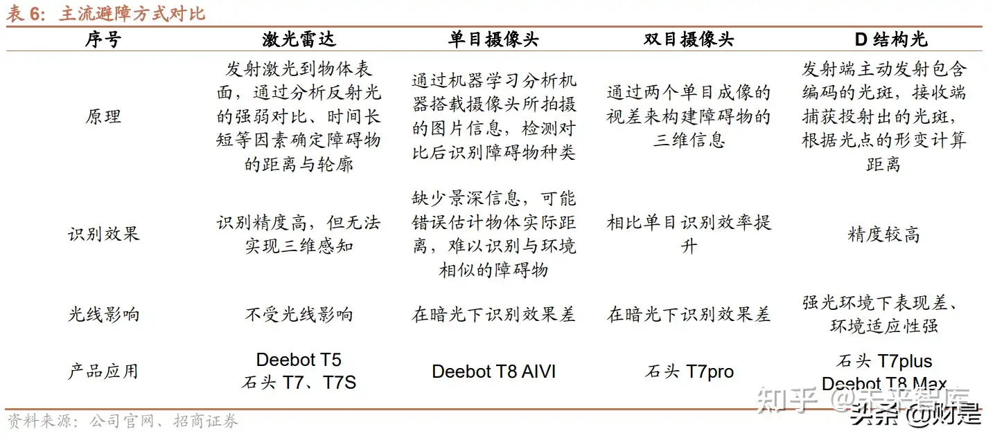 搭载 AI 结构光避障算法,有效避障。不管是双目还是单目摄像头,都存在晚上光线不好的时候识别精度变低的问 题,对此,石头科技在搭载双目摄像头的同时加入了红外线探测功能,在晚上也能达到一定的避障效果。为避免光 线变化的影响,石头和科沃斯都推出了搭载 AI 结构光避障算法的产品,在晚上也有良好的识别表现,不受光线的影 响。石头科技采用 AI 结构光中的线性结构光技术,融合直线拟合、边沿提取、噪点过滤、光心计算、阳光过滤等算 法,测量前方 5cm-80cm 距离的障碍物,能轻松避开 2.5cm 高*3cm 宽及以上的可移动障碍物,并根据用户选择减 少对固定家具的正面碰撞。