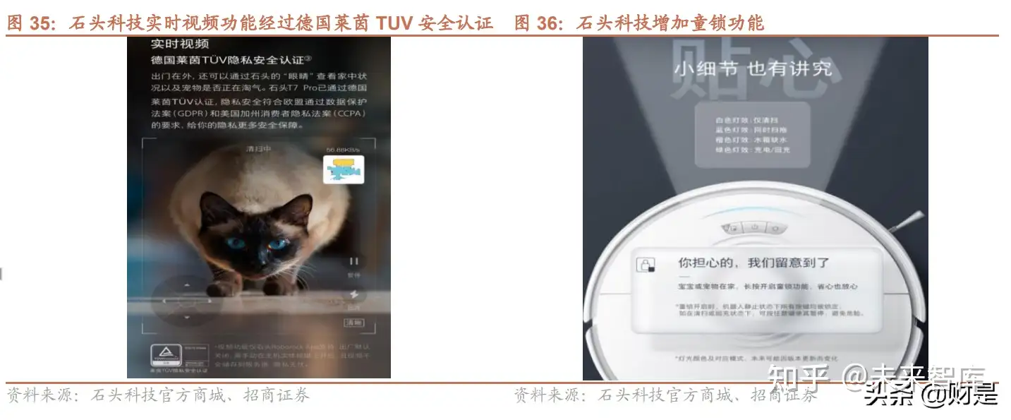 隐私安全:德国莱茵认证实时视频功能隐私安全。视觉管家功能是通过扫地机器人的摄像头与 APP 连接,可以实时 看到家中的情况,石头科技和科沃斯都有这一功能,在关于用户隐私安全的处理上,石头科技经过了德国莱茵 TUV 安全认证,且视频出厂时默认关闭,拍摄的视频也不会储存到服务器,在越来越重视隐私安全的今天,这也体现出 石头科技对消费者隐私保护的重视。