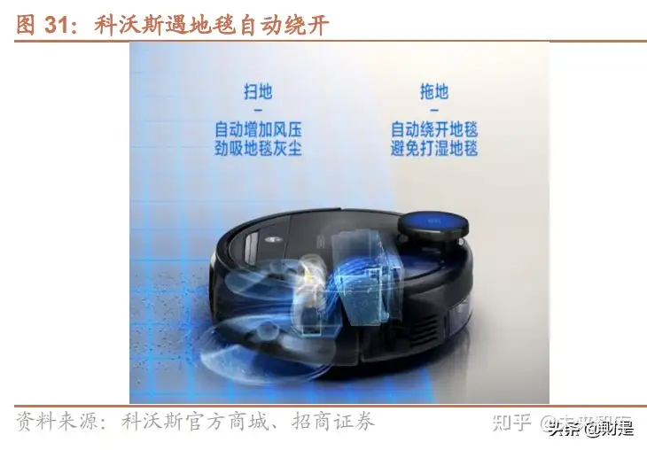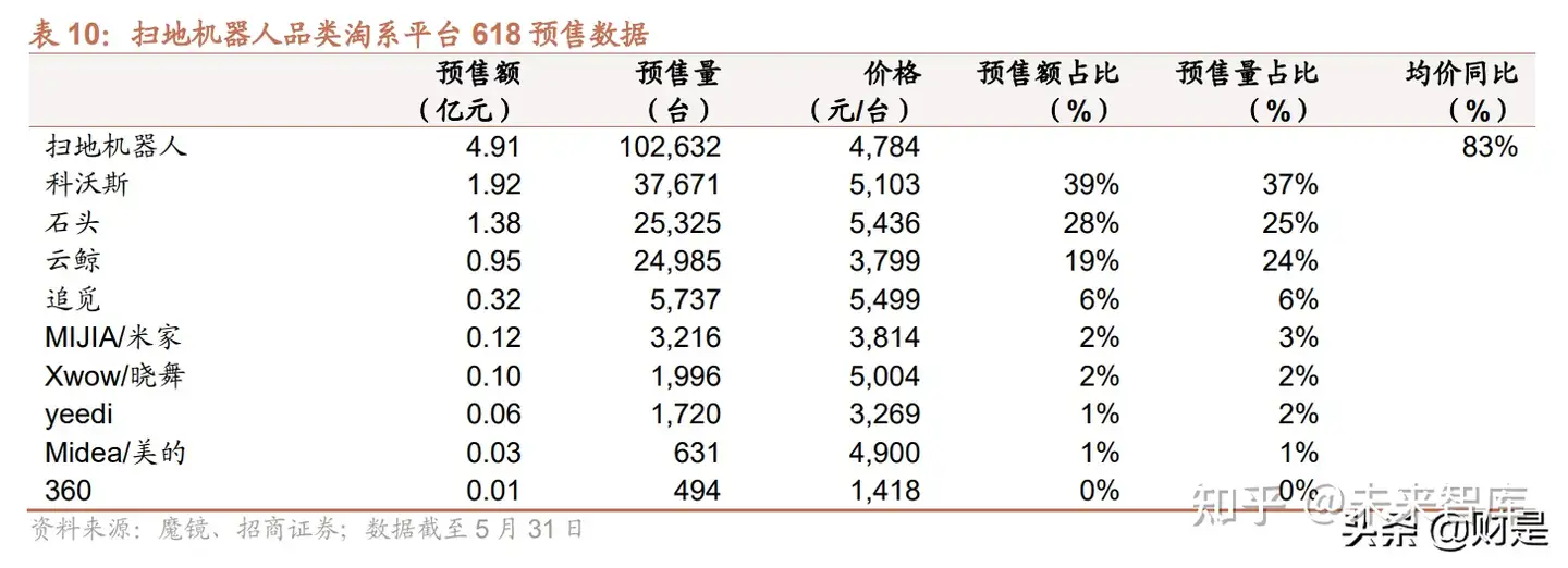 自清洁+洗地功能结合或成下一阶段产品爆点:从下一代扫地机器人创新研发角度来看,自清洁+洗地机功能结合或 成为行业创新的引爆点,以晓舞的洗地机器人为例,履带式拖布+活水洗地的结构创新,让机器人可以边拖边回收污 水,避免拖布越拖越脏造成的二次污染。参考过往云鲸通过自清洁产品推动行业创新加速,石头 G10/G10S 新品发 布以来,推动国内市场份额快速回升,截至 5 月 31 日淘系电商平台 618 数据显示,石头预售额占比迅速攀升至 28%,份额同比提高 17 个 pcts;本轮自清洁+洗地的产品迭代同样以硬件结构创新为主,去年 12 月晓舞发布产品 后,预计行业头部品牌跟进速度较快,期待行业创新后续表现。