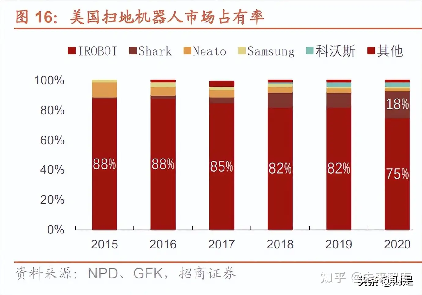与国内主要依靠线上渠道不同,由于国外的物流成本较高,运输时间长,而且在沃尔玛和 Costco 等商超就可以买到 扫地机器人,所以扫地机器人的销售场景更多是在线下,特别是商超场景中。美国的线下商超基本上都有固定的合 作公司如 iRobot、Shark、Neato、Samsung 等,线下渠道份额相对固定和集中,2015-2019 年 iRobot 份额均在 80%以上,后期美国本土品牌 Shark 份额不断提升,2020 年份额达到 18%,在美国市场排名第二。