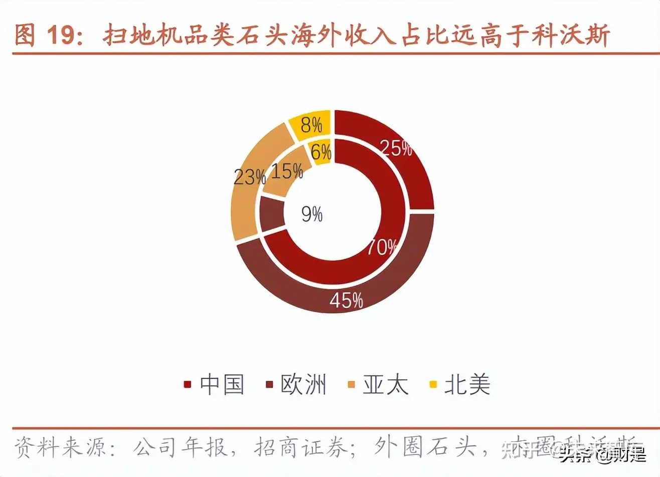石头科技 2014 年成立,2016 年发布第一款产品,2017 年出海,到 2021 年底全球市场排名第三,欧洲市场排名第 二,仅次于 iRobot,截至 2021 年,石头科技境外收入超过 40 亿,占总体收入的 70%。整体来看,石头科技收入大 部分来自于境外的分销和自建渠道的收入,石头成功出海的背后逻辑不仅仅有时代的机遇、小米生态链和慕晨、紫 光等经销商的帮助,也因为强势供应链和技术创新带来的高性价比产品直击用户痛点。这些综合因素打造了一个快 速崛起的石头科技。