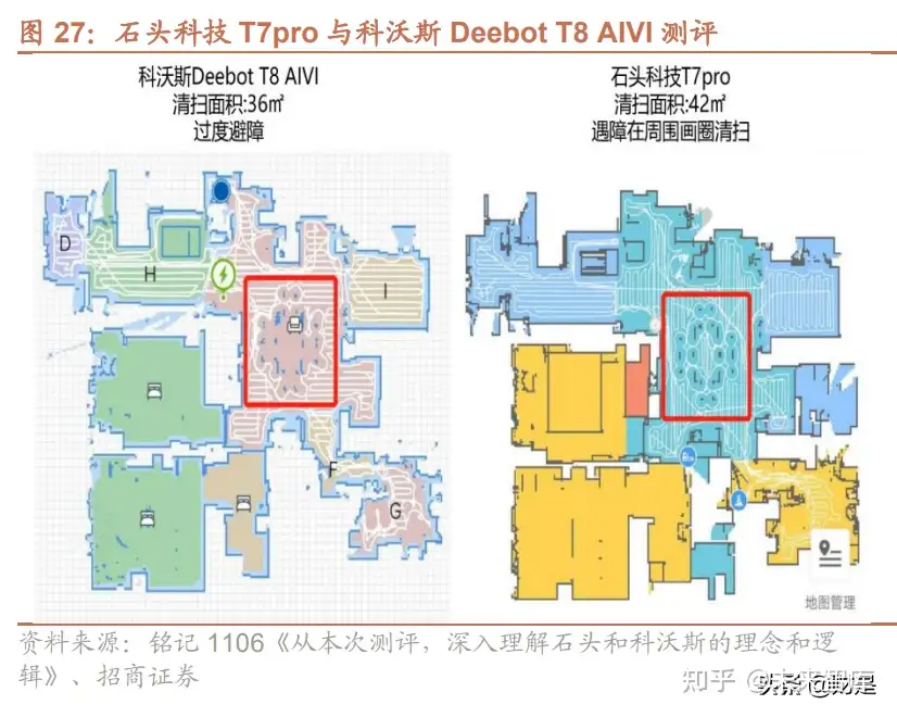 路径规划算法提高清扫覆盖率。针对狭窄区域和密集障碍物区域(比如椅子腿)的路径规划,石头科技基于 D*经典 算法理论,结合基于传感器置信度的障碍物消融算法,减小了由于传感器原理、误差、分辨率等造成障碍物位置和 尺寸的计算误差及其对路径通过性的误判影响,最大化了清扫狭窄区域和密集障碍物区域的可能性,从而提升了智 能扫地机器人的通过率和清扫覆盖率。根据铭记对石头科技和科沃斯的 2020 年旗舰新品 T7pro 和 T8 AIVI 测评来 看,在家具和障碍物摆放位置相同的情况下,石头的清扫覆盖率高出科沃斯 20%左右,主要是由于避障算法的不 同。
