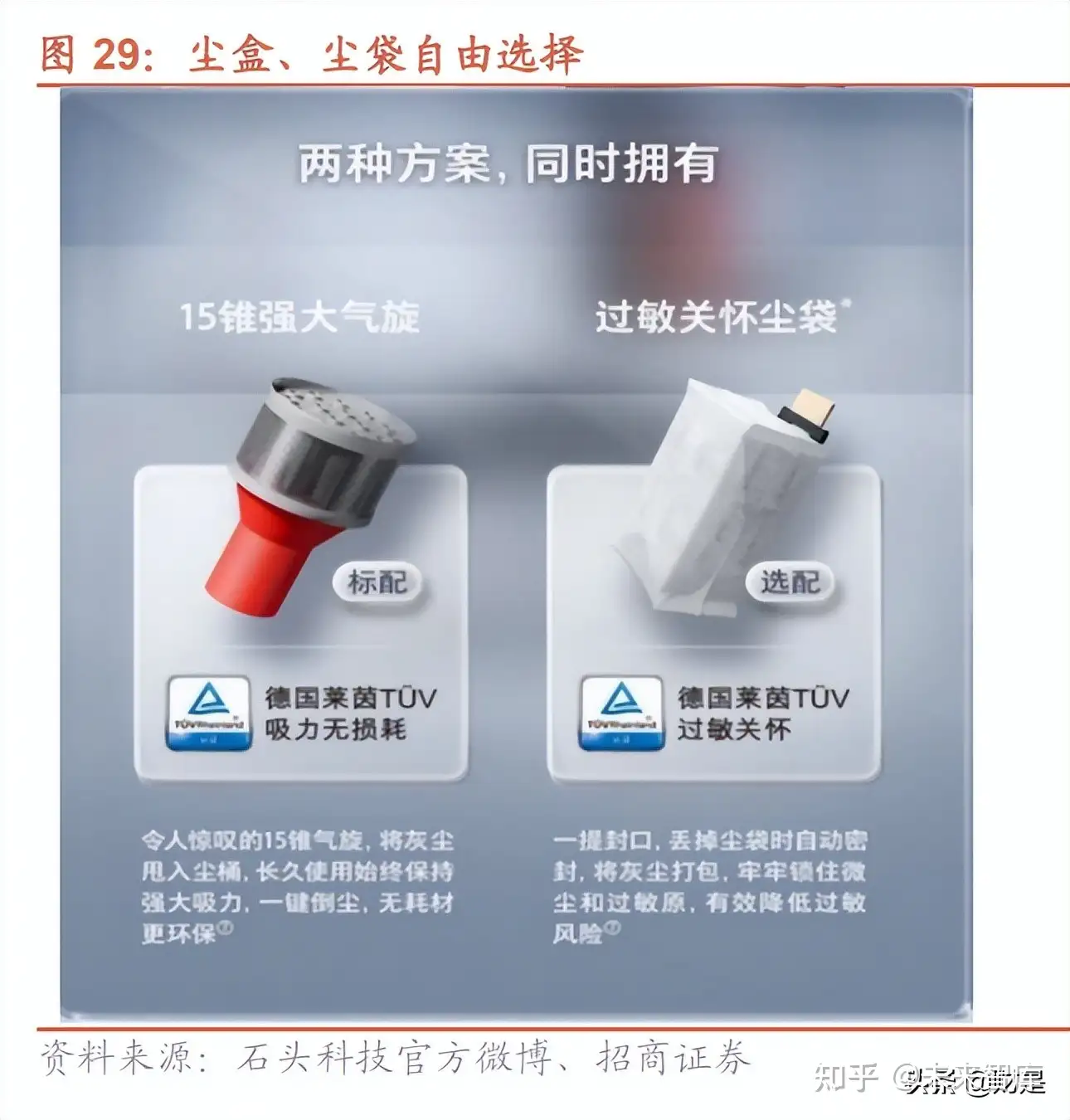 智能清洁模块一:自动集尘。自研气旋式集尘基座、德国莱茵认证吸力无损耗/过敏关怀双认证。石头科技 2021 上 半年推出自动集尘充电座,支持无耗材气旋集尘或过敏友好月抛尘袋集尘两种日常使用模式,采用可水洗前置+后置 双滤网设计,整机过滤效率高达 99.99%,标配的气旋无耗材集尘方案采用了两级十五椎气旋可水洗设计,可选过敏 关怀尘袋集尘方案,其采用一提封口自动打包设计,有效防止灰尘外溢降低过敏风险,智能集尘功能减轻用户每日 清扫和倒尘盒工作,并延长滤网使用时间。石头科技自动集尘充电座 2021 年 5 月达成全球首个德国莱茵 TUV 双认证成就:尘袋版获得全球首个过敏关怀(Allergy Care)认证,牢牢锁住微尘和过敏原,过滤效率达 99.99%,降低过 敏风险;帮用户彻底“解放双手”,在集尘和更换尘袋的最后一步享受到便捷与清洁;气旋版获得吸力无损耗认 证,长久使用持续保持强大吸力。通过严格测试,证实吸尘器每次使用中(电池快没电时、尘桶将满时)吸力损耗 都不超过 3%。