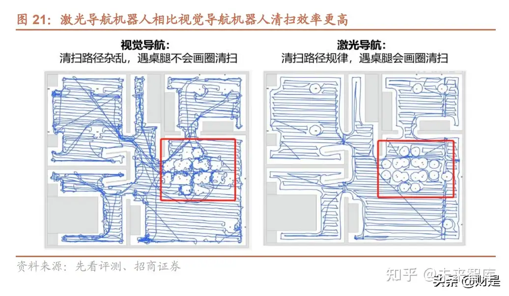 激光导航建图清扫效率优于视觉导航。通过先看评测的测评,带激光导航的机器人清扫效率明显更高,即使在在无 光的环境也能精定位建图,并且地图可以储存;带视觉导航的机器人虽然也会建图,但存在建图慢和容易受光线影 响的问题,建图不够精确。在有多个房间的实验室中,iRobot I7+没有明确的房间清洁顺序,遇到桌腿类的障碍物不 会画圈清扫,规划路径有时不平行于墙,综合表现激光导航更胜一筹。