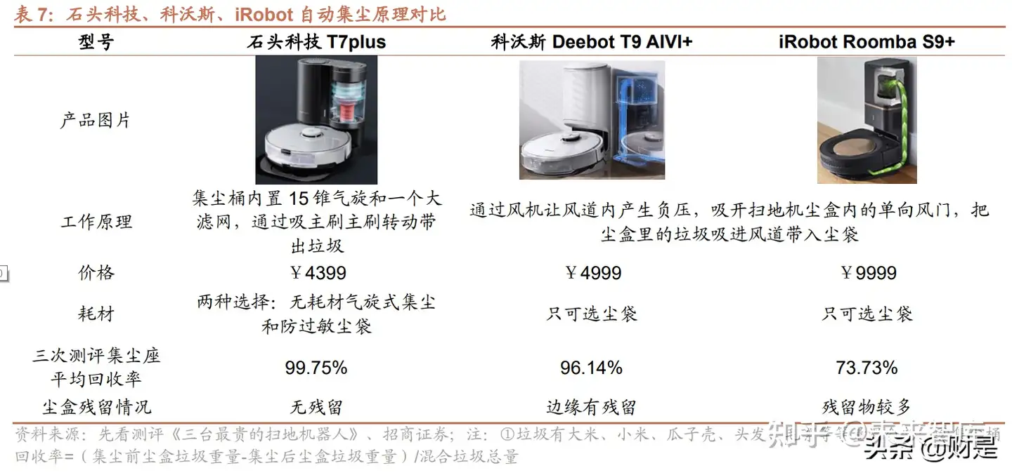横评表现优秀:与 iRobot 和科沃斯相比石头价格更低,集尘效果最好。自动集尘功能为扫地机器人配置基站,可 以把倒垃圾的频率从两天一次降低到一两个月一次,该功能由 iRobot 首创运用于 2019 年推出的 Roomba i7+,后来 石头科技和科沃斯都相继推出了带有自动集尘功能的扫地机器人 T7plus 和 DEEBOT T9 AIVI+。iRobot 和科沃斯的 集尘方案相似,通过风机让风道内产生负压,将扫地机尘盒内的单向风门吸开,再把尘盒里的垃圾吸进风道带入尘 袋。石头的集尘桶内置一个 15 锥气旋和一个大滤网,通过主刷转动带出垃圾。