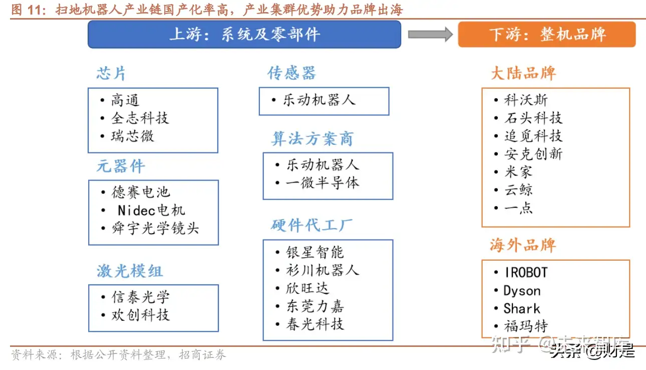 扫地机器人产业链国产化,强势供应链助力出海。中国是全球吸尘器和扫地机器人的产业链集群所在地,2021 年中 国累计出口吸尘器(含扫地机器人)16248 万台,累计同比增长 10%。从扫地机器人产业链来看,满足室内低速无人 驾驶相关的 AI 智能要求对主控芯片算力要求不高,国产供应商全志科技、瑞芯微乃至地平线都可以满足;元器件方 面电池、电机、镜头、激光模组、传感器等零部件在业内都有成熟的供应商;算法方面头部品牌基本自研,二三线 品牌也可以从外部找到算法外包商;代工厂资源方面 3C 电子产业培养出了一批优质供应商,集中在珠三角和长三 角,例如捷普电子主要为 iRobot 代工,深圳智意主要为 iLife 代工,银星、衫川代工小米,台湾松腾代工家卫士、惠 而浦、飞利浦、bissel 和霍尼韦尔等,其他生产需要的塑料原材料、各种型号的主板、低附加值的芯片模组等上游 产品也容易获得,综合来看国内的产业链集群优势为扫地机器人的制造提供了地理优势,同时国内的工程师红利、 低廉的生产成本和人工成本,叠加起来共同构成了中国扫地机器人供应链的全球竞争力。