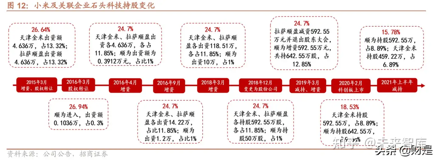 早期小米生态链赋能,海外销售助力“去小米化”转型。石头科技 2014 年成立伊始便成为小米生态链企业,创业 初期获得小米品牌背书、供应链资源、产品定义设计、投融资帮助和渠道销售等全方位的赋能与支持,同时小米参 股不控股的做法也让创始团队保留对公司股权控制及核心技术的把握,为后期自有品牌建设打下基础。公司在 2016 年 9 月推出第一款产品“米家扫地机器人”大获成功,2017 年 9 月推出首款自有品牌产品石头智能扫地机器人,同 年公司与慕晨、紫光、俄速通等经销商合作,迅速打开海外市场。2020 年 2 月,石头科技在科创板成功上市,凭借 自主品牌海外销售的高歌猛进,公司顺利开启“去小米化”战略,到 2021 年公司自有品牌的营收占比达到 99%, 基本摆脱对小米订单的依赖。