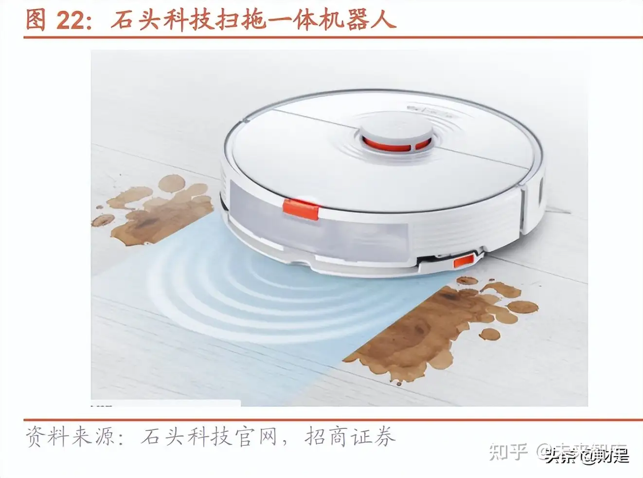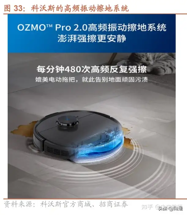 石头科技的扫拖一体机器人采用声波震动拖地模组,最高震动频次达到 3000 次/分钟,对顽固污渍有较好的清洁效 果:拖布分为震动区和收纳区,声波震动模组位于拖布中间的位置,拖布边缘吸附污垢,避免水花飞溅和出现水 痕。目前 iRobot 没有扫拖一体的机器人,科沃斯的扫拖一体机器人采用高频振动擦地系统,频次可达 480 次/分 钟,根据先看评测对石头 T7plus 和科沃斯 Deebot T9AIVI+的实测来看,针对干了三个小时的咖啡渍,石头的清洁 效果更好,可见震动的频次对清洁的效果是有影响的。