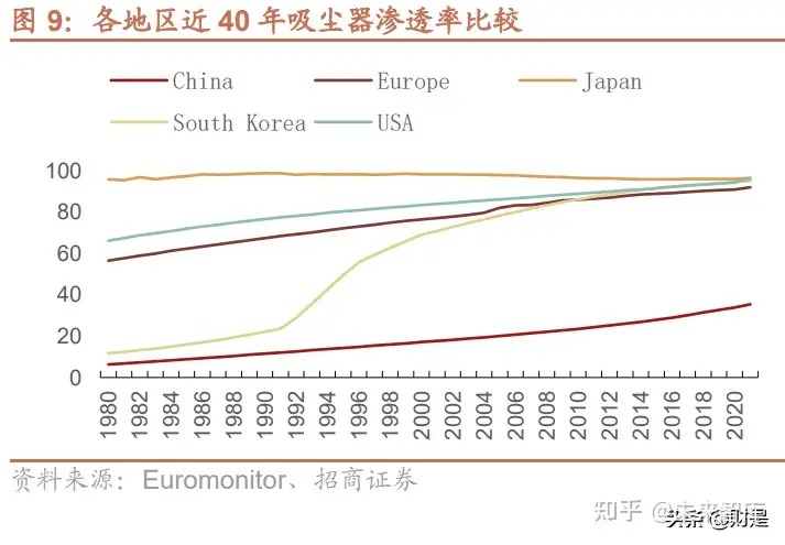 从总量而言,2021 年全球吸尘产品销量 1.48 亿台,其中扫地机器人占比 10.6%,对应销量 1561 万 台,仅次于圆筒式 30.8%、推杆式 21.9%和立式吸尘器 15.4%;分地区来看,北美、亚洲、西欧、东欧分别占全球 吸尘器销量比重达 28%、27%、25%和 10%,分别对应年销量 4142 万台、3918 万台、3629 万台和 1557 万台; 其中美国和中国 2021 年吸尘器销量排名前二,分别贡献 3819 万台和 2275 万台。从渗透率角度来看,中国吸尘器 渗透率 35.4%,低于全球平均 43.2%,更远低于美国、日韩及欧洲等发达地区,同时也表明国内吸尘器市场未来提 升空间依然广阔。