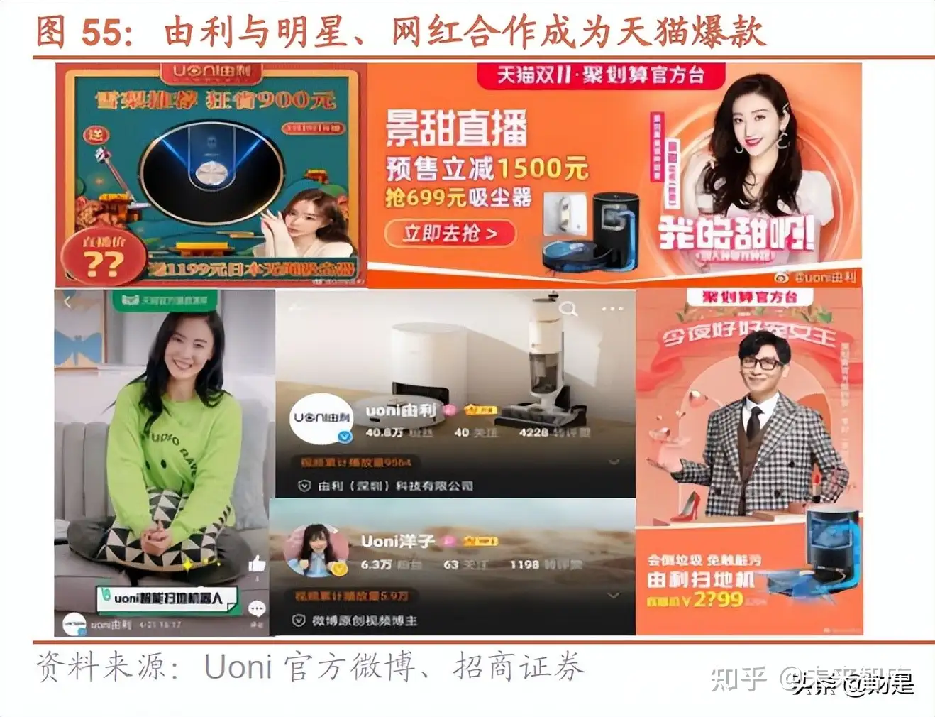 由利加强与流量方的合作,并在尝试、探索多种低成本流量获客方式。2017 年 8 月由利在深圳注册成立,全资收购 由利株式会社旗下的日本及国内由利(uoni)品牌的电器类目后,双方合作由日本由利进行工业设计,由国内主体 进行产品研发、量产和销售,2020 年正式进入扫地机器人领域。1)与天猫达成深度合作。2020 年 6 月,由利开启 全新的直播带货营销思路,与聚划算官方直播合作,通过参与天猫直播,团队多场单场活动达到了 300 万元左右的 销售额。2020 年 9 月,由利与天猫国际达成战略合作。2)除天猫渠道外,团队也在重点通过 KOL 进行获客,团队 创始成员中本身就有生活方式类的 KOL(Uoni 洋子),也积累了相应的 KOL 资源。目前和团队关系紧密的 KOL 有 大约 18 人。
