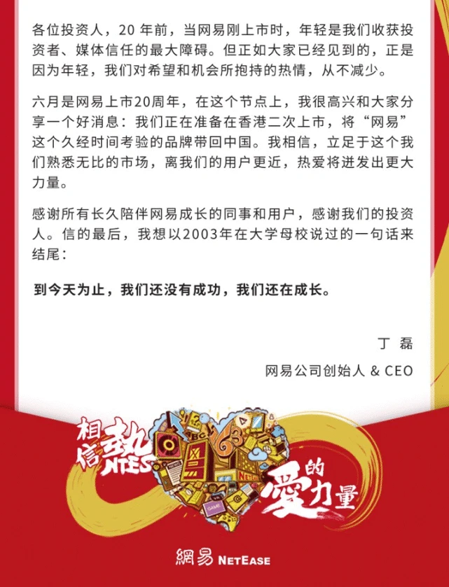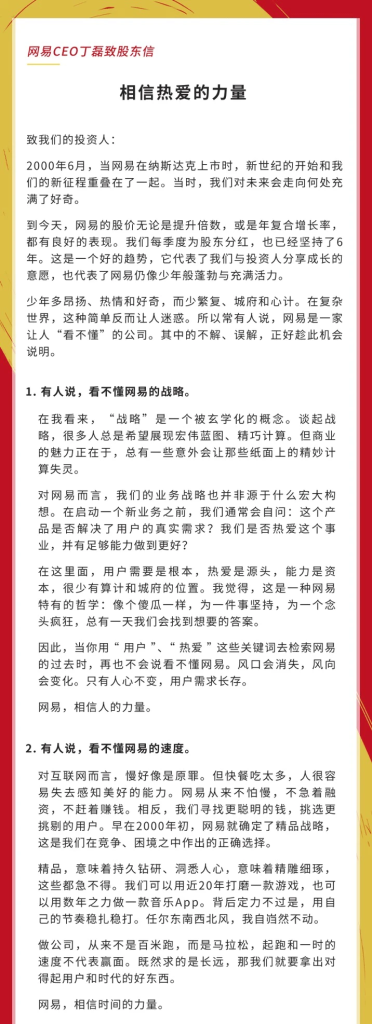 日前,网易创始人、CEO丁磊发布了公司上市20年来的首封致全体股东信《相信热爱的力量》。丁磊用“三个相信”首次回答了20年来外界对“网易战略、网易速度和网易边界”的困惑与误解。网易“不褪少年锐气,不沾老年暮气”“网易仍像少年般蓬勃与充满活力。”