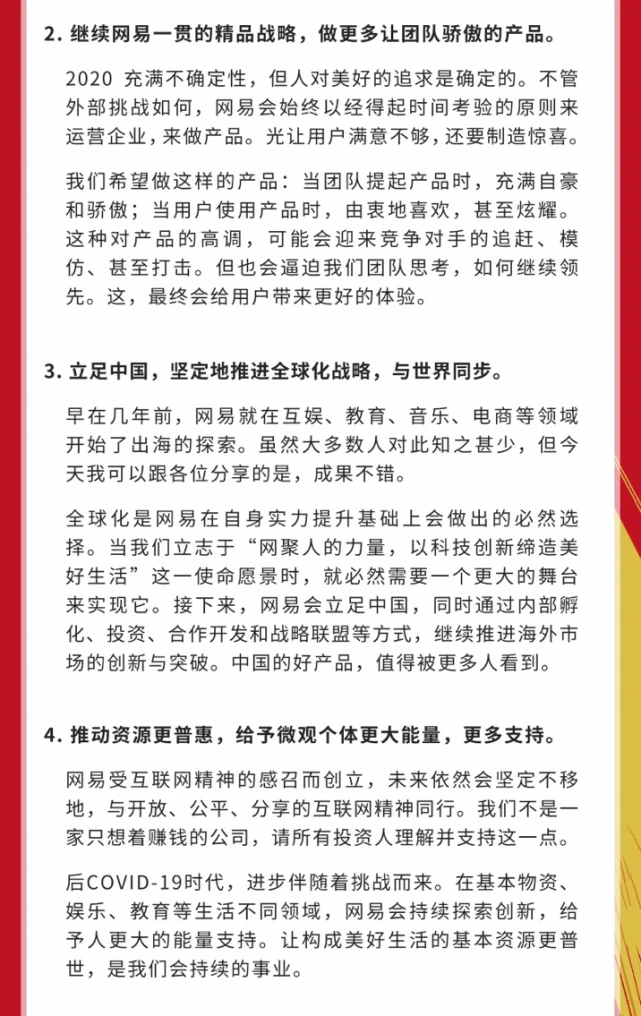 公开信中,网易未来会着力做好四件事:第一,建立一个有自我进化能力的组织,永远保持29岁;第二,继续网易一贯的精品战略,做更多让团队骄傲的产品;第三,立足中国,坚定地推进全球化战略,与世界同步;第四,推动资源更普惠,给予微观个体更大能量,更多支持。
