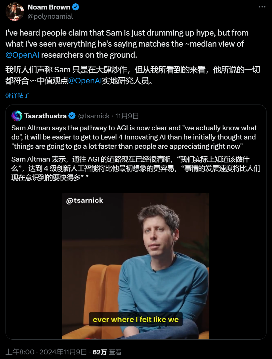 OpenAI CEO Sam Altman:我认为,从现在到实现 AGI 还有很长的路要走,有很多已知的未知因素,但我认为我们基本清楚了前进的方向,这需要时间,也会很艰难,但这非常令人兴奋。在产品方面,我们还有很多需要探索的地方,但我们大致知道目标是什么,以及如何优化。这很关键,当方向明确时,你就能快速前进。是的,如果你愿意专注于少数几个关键方向,并把它们做到极致,我们的研究路径、基础设施路径,以及产品路径就会越来越清晰,你就能更好地整合资源。很长一段时间里,我们并没有这样做,我们更像是一个纯粹的研究实验室,即使你心里清楚方向,也很难坚定地执行,因为还有很多其他看起来很有希望的方向值得探索。是的,但让所有人团结一致,朝着同一个方向前进,是决定你能跑多快的重要因素。
