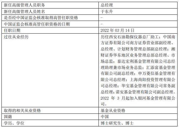 3月15日,银河基金发布公告,宣布于东升成为该公司新任总经理,同时代任董事长,任职日期均为3月14日。刘立达则因“工作变动”离任董事长一职,离任日期为3月14日。