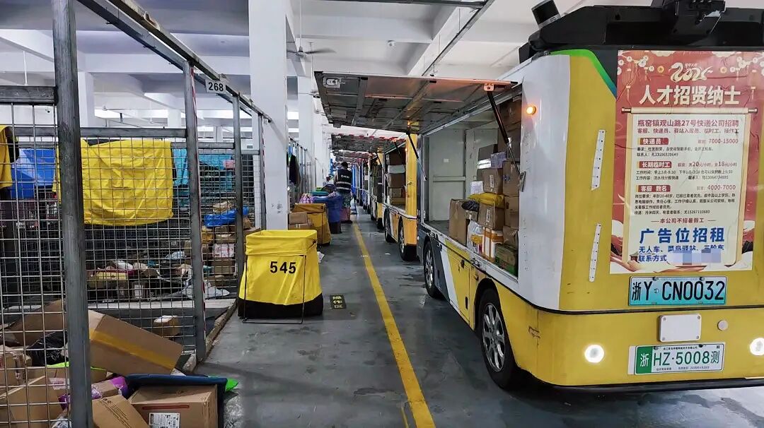 在杭州余杭区瓶窑镇的一个快递共配中心,每天有近10万个快递,由35台菜鸟无人车运往各个驿站,占包裹总量的70%。同时最多17辆无人车围在快递传送带两侧装货,装满后挨个驶出共配中心,前往60多个快递驿站。