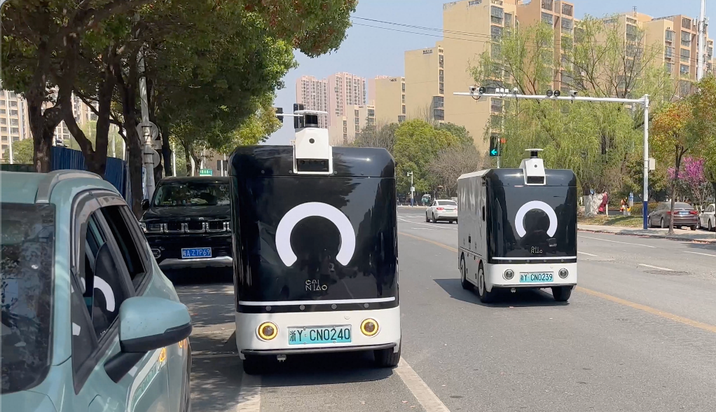 这个物流共配中心,从2024年4月份开始试用菜鸟无人车,2025年初开始陆续加到了35台。