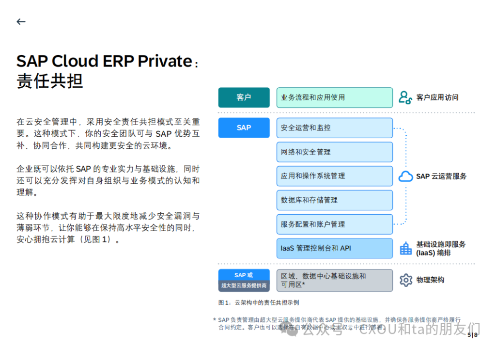 责任划分清晰:客户负责业务流程与应用使用、应用访问及安全运营监控;SAP负责网络安全管理、云运营服务、系统与数据库管理等核心环节,同时管理超大型云服务商提供的基础设施,客户也可选择自有数据中心或主权云部署。