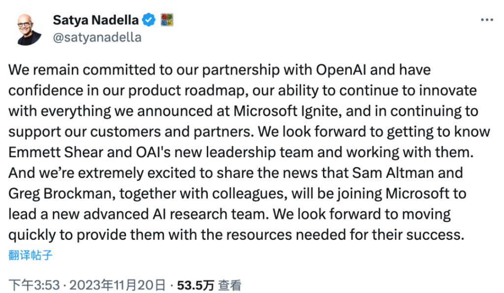 我们仍然致力于与 OpenAI 的合作伙伴关系,并对我们的产品路线图、我们在 Microsoft Ignite 上宣布的一切继续创新的能力以及继续为我们的客户、合作伙伴提供支持的能力充满信心。我们期待了解 Emmett Shear 和 OpenAI 新领导团队,并继续与他们合作。我们非常高兴地分享这样的消息:Sam Altman 和 Greg Brockman 及其同事将加入微软,领一个新的高级 AI 研究团队。我们期待迅速采取行动,为他们提供成功所需的资源。