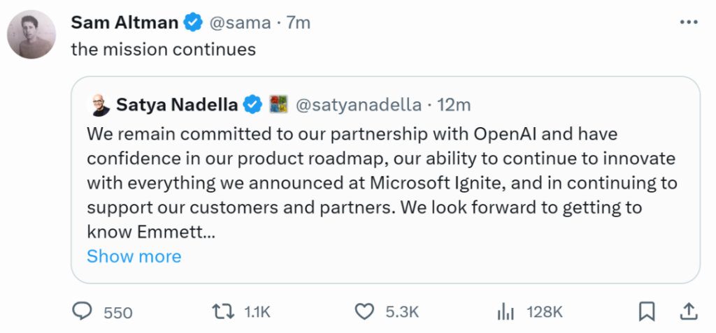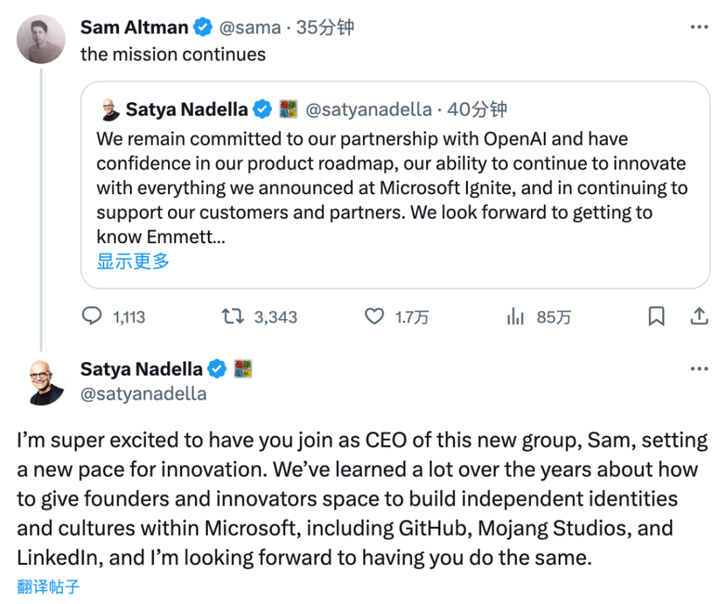 被逼退出 OpenAI 的 Sam Altman 也转发了这个推文,证实了纳德拉的说法,并表示:使命继续。
