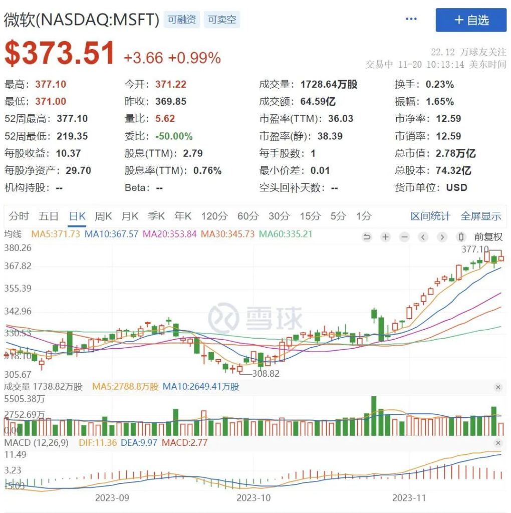 奥特曼加入微软的消息传出后,市场立即给出了积极的响应,周一微软开盘股价上涨,收回了周五的缺口。