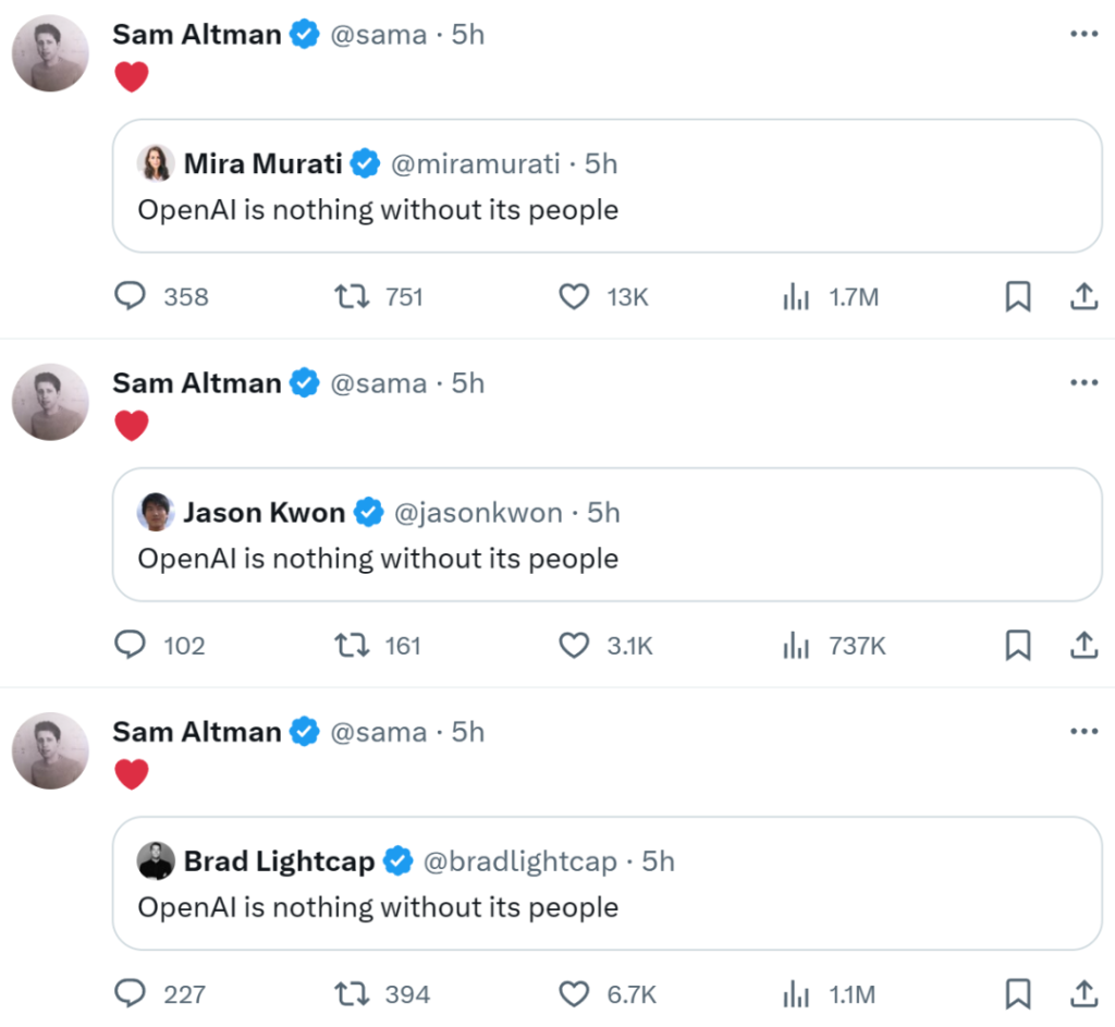 先是包括 Mira Murati 等员工在 X 上接力发表:OpenAI is nothing without its people(没有员工,OpenAI 就一无是处)来支持 Sam Altman(Altman 也一一回复爱心)。 CXO UNION-CXO联盟(cxounion.cn)