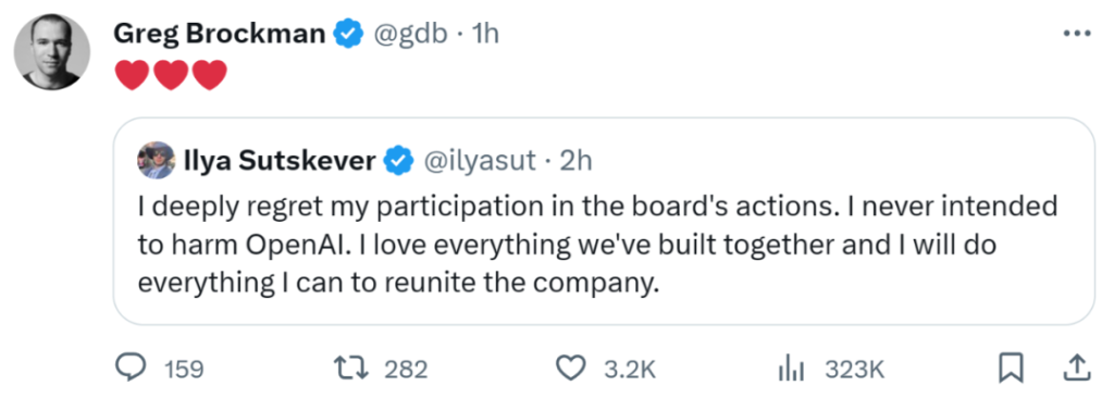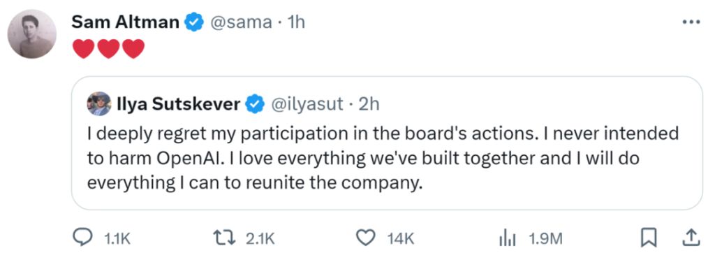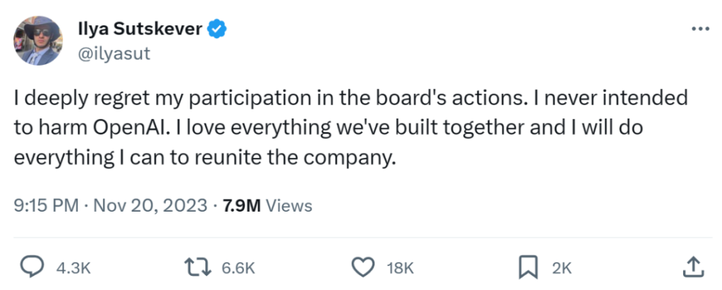 I deeply regret my involvement with the board. I never meant to hurt OpenAI. I love what we have built together, and I will do whatever it takes to bring the company back together.