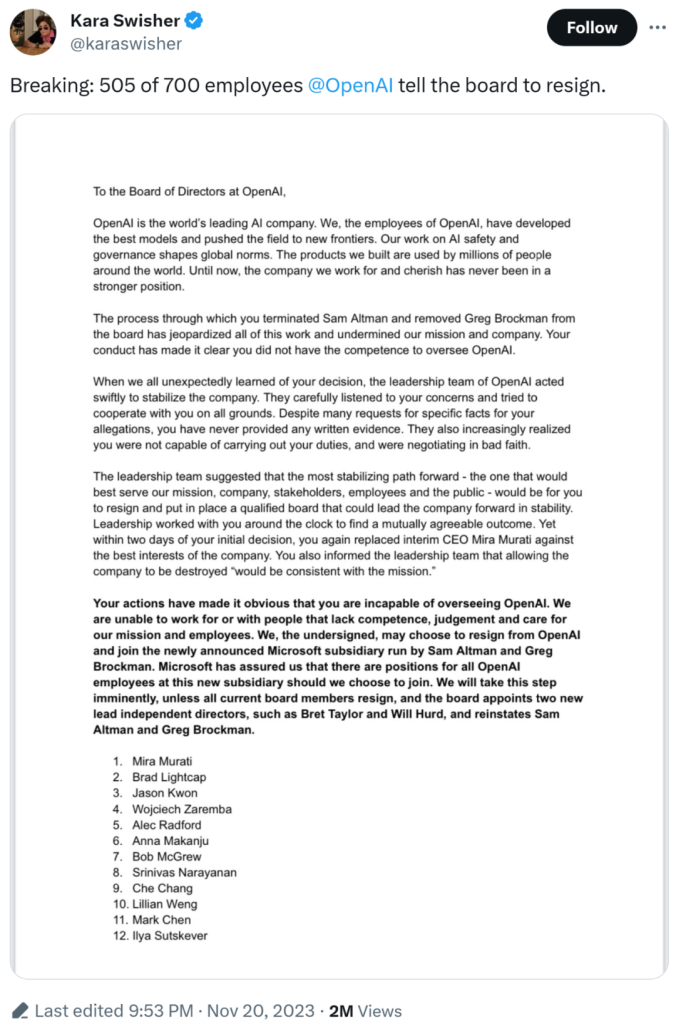 Your actions have shown that you are incapable of policing OpenAI. We cannot work with people who lack competence, judgment, and indifference to our mission and our people. We, the undersigned, will choose to resign from OpenAI and join the newly announced Microsoft subsidiary run by Sam Altman and Greg Brockman. Microsoft assured us that all OpenAI employees at this new subsidiary would have positions if we chose to join.
