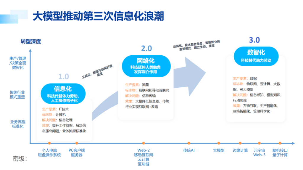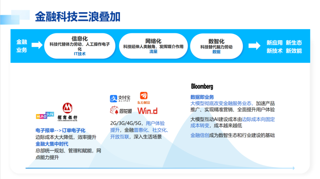 在我看来,这背后基本经过了三个阶段:一是信息化阶段,用电脑处理一些流程性工作;二是网络化阶段,PC到移动互联网,交互方式发生了根本性变革,时间空间被压缩;三是数智化阶段,即今天大模型带来的突破。数智化阶段实际上是基于真实决策能力的替代,这就使得整个社会包括对金融行业的进步可能会产生巨大的影响。