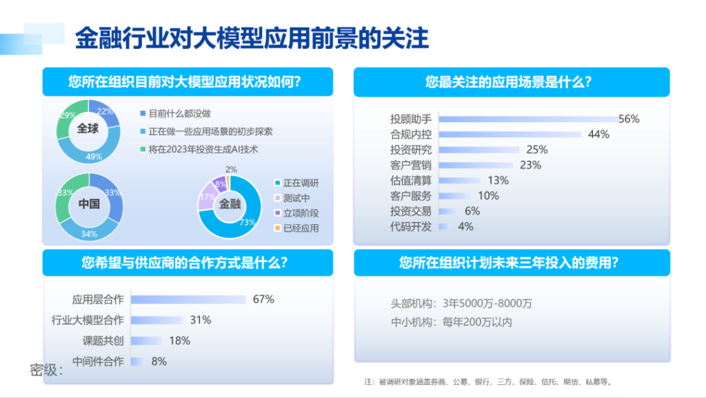 Going back to the actual situation, we did a wide range of research this year. The survey results show that the financial industry has maintained great attention to the application of the large model industry, and basically all financial institutions are trying and researching, but the real application is still relatively few. I listed a number of different application scenarios from investment counsel to code development, and overall, close to 10% of financial institutions have already implemented or implemented large model applications, whether internal or external. At the same time, we have made certain plans for the future investment in the application of large models.