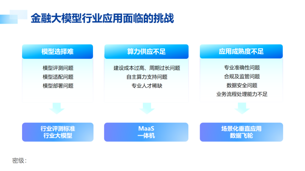 金融大模型行业面临的挑战是,选择什么样的模型?需要考虑到模型的技术能力、合规性、适配性以及如何评测等问题。算力供应不足如何解决?以及应用层如何发展?应对系列挑战,我们提出以下三方面落地途径: