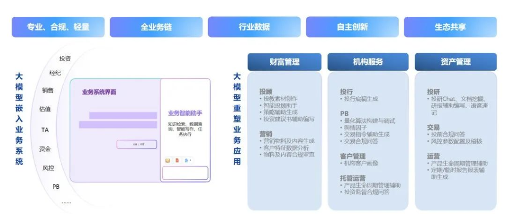 Third, build the scene. Based on scenario-driven development of large model applications in the financial industry, such as investment assistant, investment research scenarios in asset management. From assistants to the generation of research reports, the practical effects of these technologies are already being seen. In the long run, with the help of large model capacity, many operational links of financial institutions may be able to achieve more than 50% or even more than 70% efficiency improvement, and the fields of vertical application will be more and more extensive.