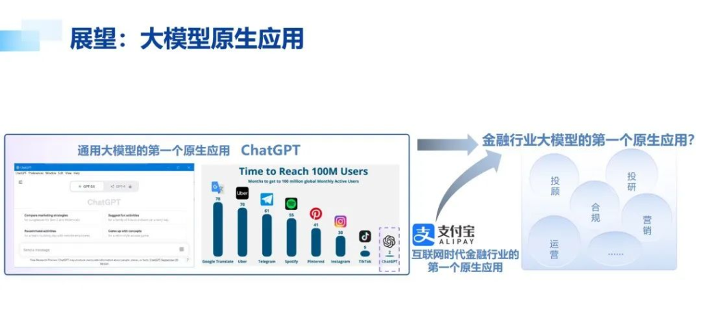 第一,我们看到过去一些APP等应用的用户数达到1亿级别的时间越来越短,最新的是ChatGPT仅用了2个月时间。我们不知道金融行业基于大模型原生应用会以什么方式出现,什么时候出现。我相信,如果金融行业出现大模型原生应用的话,它仍将会是一个强大的创新并吸引众多用户使用,也会带来金融行业的业态新变化。
