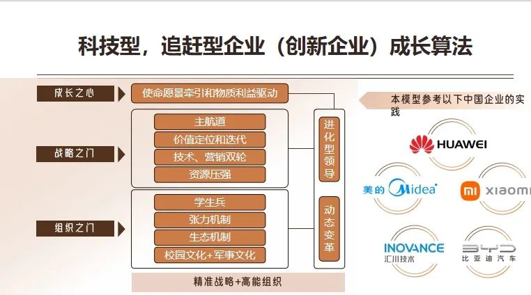 实际上,这几十年来中国的企业家也一直带领着企业在创新的道路上奔走。我也一直在跟踪、研究国内了一些优秀企业。我大概参考了华为、小米、比亚迪、汇川技术、美的等企业的实践,概括出中国企业的成长算法。