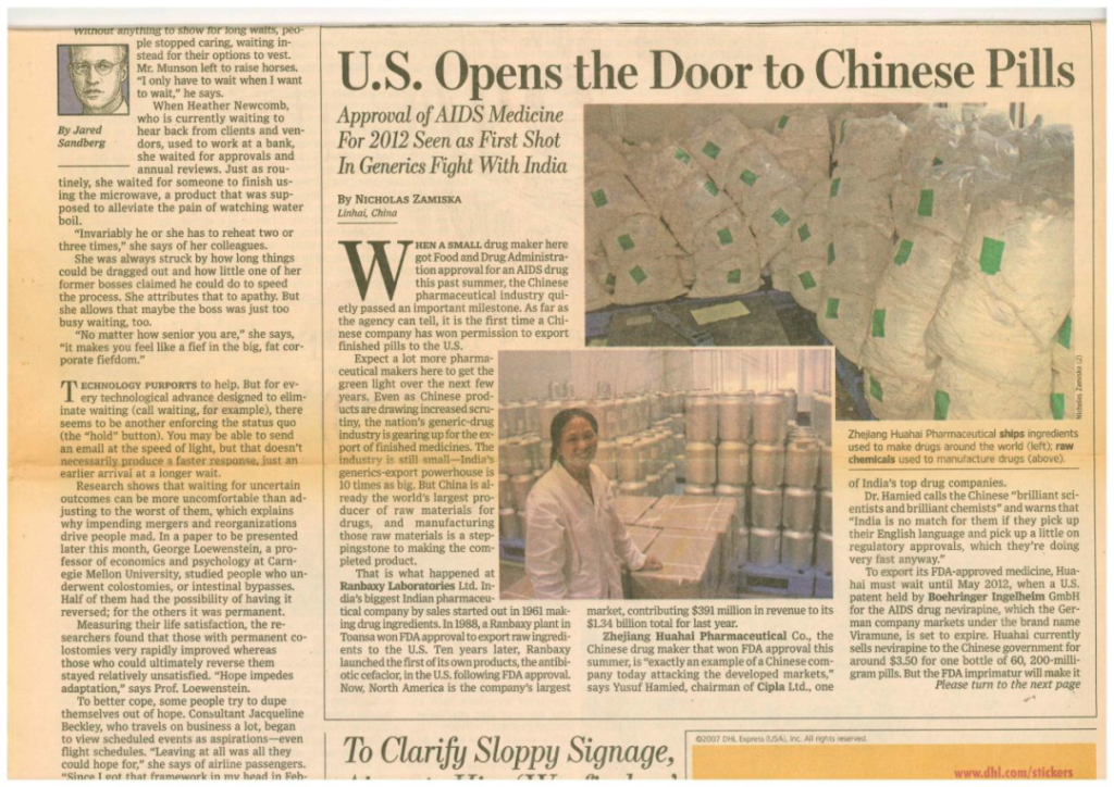 After four years of hard work, on September 10, 2007, Huahai Pharmaceutical finally completed China’s first FDA certification. At that time, the Wall Street Journal and CNN television in the United States rushed to Zhejiang Taizhou Linhai Xinqiao Town to interview Huahai Pharmaceutical, and the United States used the Wall Street Journal to publish the following: US opens the door to Chinese phills, US opens the door to Chinese phills, CXO UNION-CXO联盟(cxounion.cn)