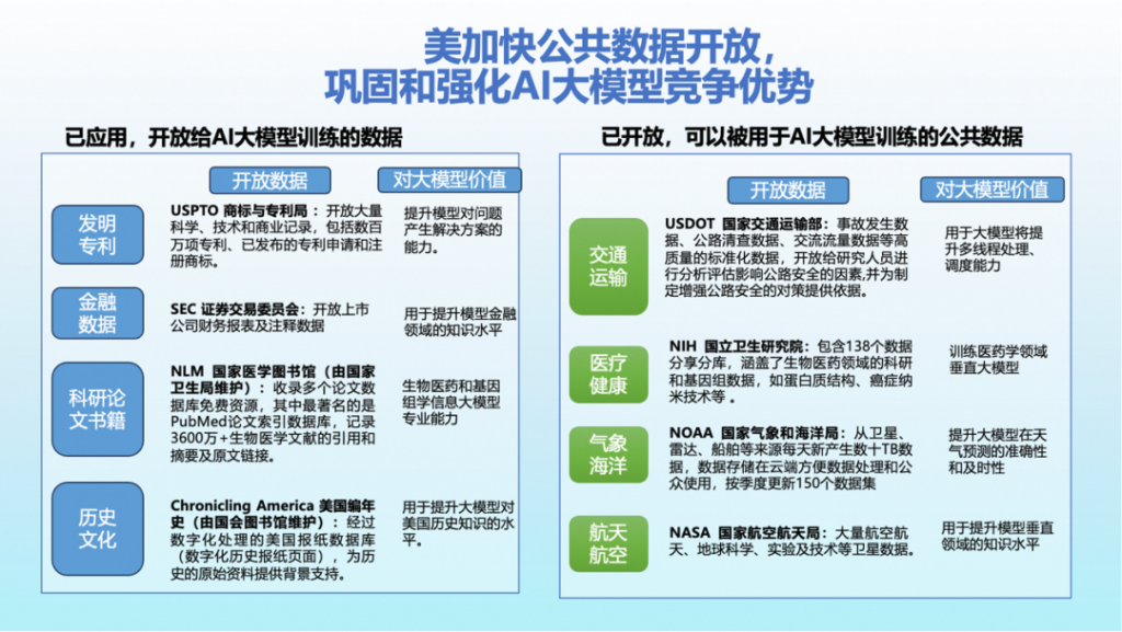 今天的AI竞争不是单一技术的竞争,而是一场体系化竞争。美国不仅有芯片、模型、云计算,我们还观察到,在数据开放领域,美国公共数据的开放力度更大。目前美国已经将发明专利、金融数据、科研论文书籍、历史文化、交通运输、医疗健康、气象海洋、航天航空等高质量数据开放出来。