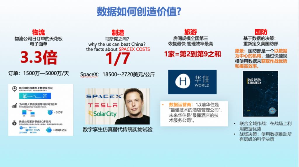 Practice is the only standard to test truth, application is the only standard to test the value of data (Jiang Qiping), how to understand data, or return to the front line of technology and business, back to the scene of data to create value. We look at how data can create value in seemingly unrelated fields such as express logistics, manufacturing, hotel services, defense and military.
