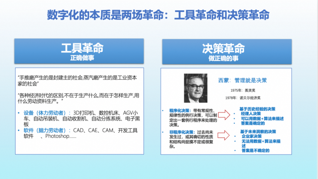 But it’s not enough to “do it right,” it’s more important to “do the right thing.” Today we’re talking about data, and data is leading to a revolution in decision making – a “decision revolution” that helps people do the right thing. As Simon, a Turing Prize winner and Nobel laureate in economics, has said, the core of management is decision-making. Decisions can be divided into two categories: procedural decisions and non-procedural decisions.