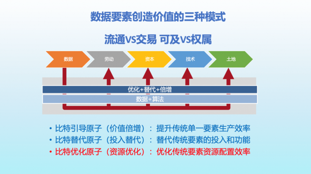 Third mode: Bit optimization atom (resource optimization). Data factors not only bring the multiplier effect of single factors such as labor, capital and technology, but more importantly, improve the efficiency of resource allocation among traditional factors such as labor, capital, technology and land. Data can’t produce steamed buns, cars, or houses, but data can produce steamed buns, cars, and houses at low cost, high efficiency, and high quality, and provide public services efficiently. Data factors promote revolutionary fusion and fission of traditional production factors, and become a key factor driving sustained economic growth. This is where the real value of the data element lies.