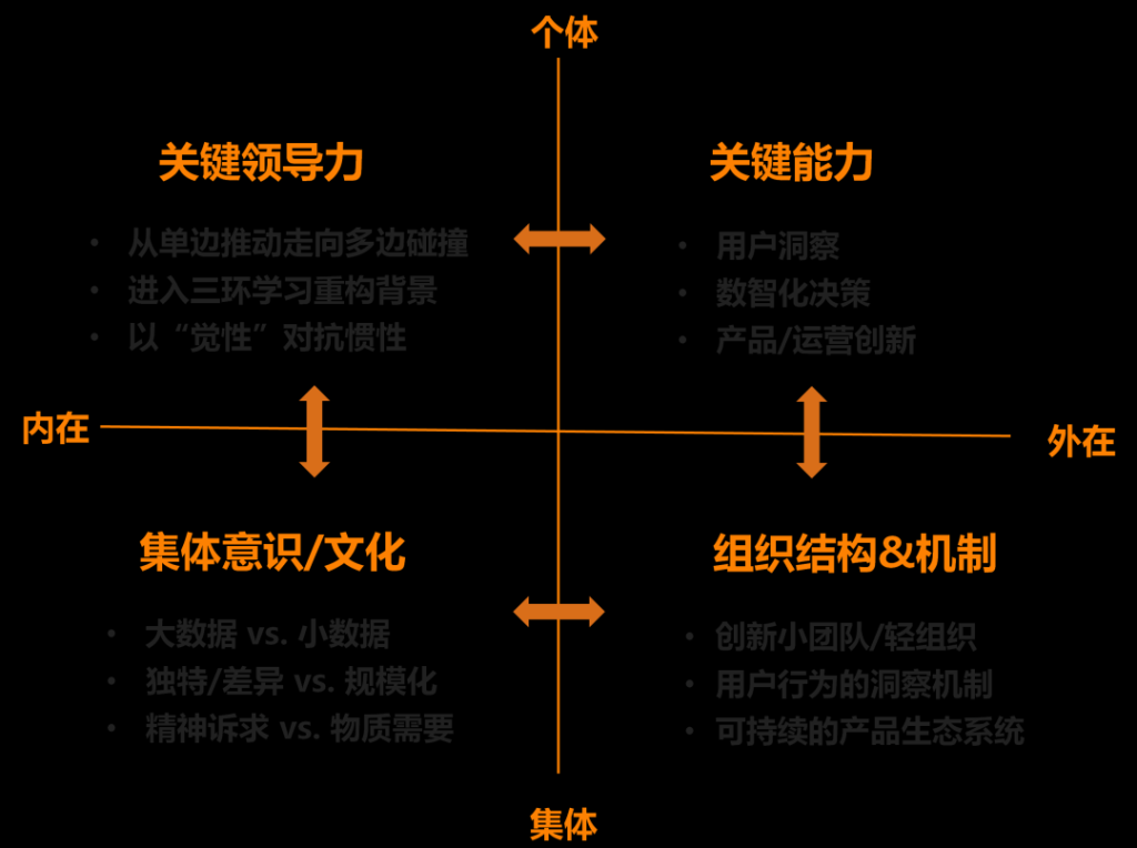 It borrows the model of an integrator and makes some changes from the perspective of organizational development. The model is very simple, the vertical axis is the individual and the collective, the horizontal axis is the external and internal. Any problem, any phenomenon has individual and collective, external and internal factors. These four quadrants represent four dimensions, and all organizational changes and upgrades cannot be completed if they only start from a single dimension without comprehensive consideration from the four dimensions.