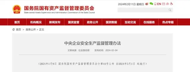 近日,国务院国资委发布《中央企业安全生产监督管理办法》,明确国务院国资委对中央企业安全生产实行分类监督管理。