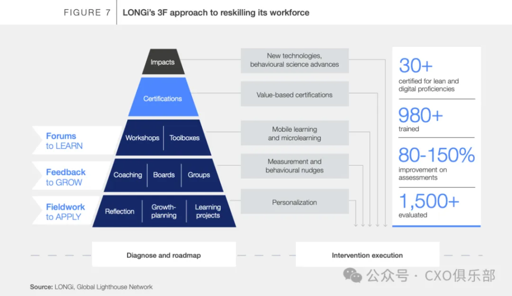For the “lighthouse factory”, it also needs to retrain workers to cooperate with the 4.0 revolution of the factory. Longi Green Energy, a Chinese solar energy company, was awarded the “Lighthouse Factory” in 2023. The white paper cites Longi Green Energy as an example, saying that it has implemented an internal evaluation training certification system and customized learning and development plans for nearly 1,000 employees. CXO UNION-CXO联盟(cxounion.cn)
