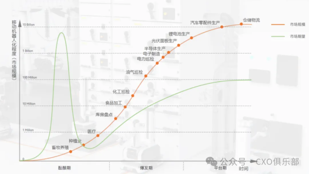 在过去的一段时间里,我们对各个行业对智能工厂以及工业移动机器人的需求进行了观察和研究,如图5所示。在酝酿期,机器人在智能工厂中的作用是逐步递进的。前期移动机器人主要在仓储物流领域发挥作用,并逐渐扩展到汽车零部件、锂电池生产、光伏生产和半导体生产等领域。这种需求在快速增长的行业中仍然存在,例如库房管理、食品加工和化学等行业。绿色曲线代表了市场的预期变化。当移动机器人进入工厂时,工人对其寄予了很高的期望,并投入了大量精力。然而,从2017年到2020年的三年间,这种预期正在逐渐下降,许多工厂在规划过程中将功能岛和移动机器人结合在一起,逐步穿越每个生产过程中的周期性变化。