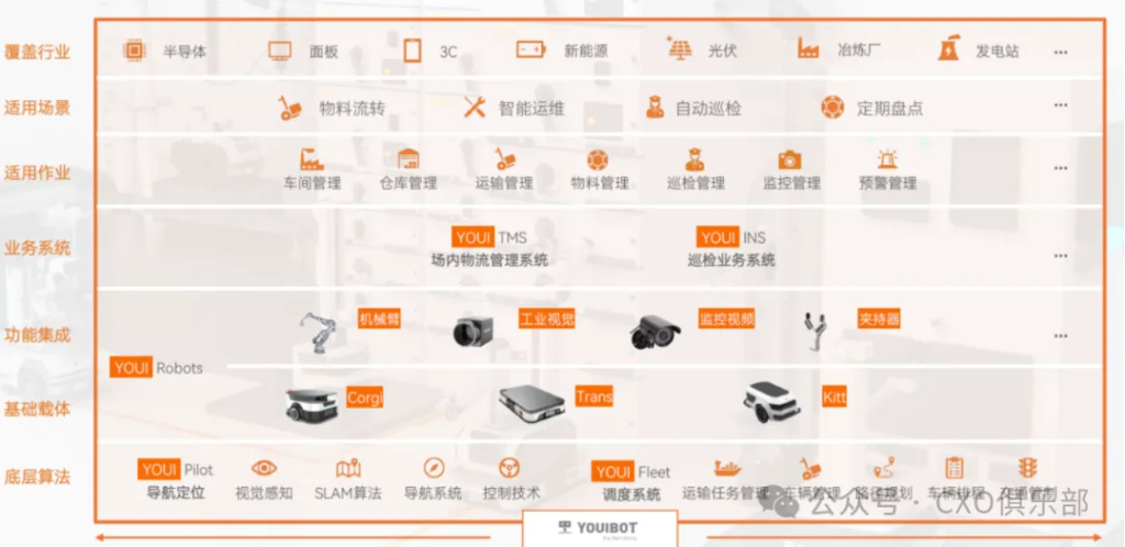在智能工厂的特征中,出现了逐渐向上递增的需求,如图4所示。目前整个智能工厂需要在物质流、信息流和决策流三个流通方向上进行主要的打通。在打通物质流方面,智能工厂和工业移动机器人的连接成为关键核心单元。在自动化单元中,移动机器人自已经取得了一些成功。然而,每由于每个功能岛之间仍存在隔阂和断裂,导致大量信息单元的缺失,这将影响库存效率和生产效率。 CXO UNION-CXO联盟(cxounion.cn)