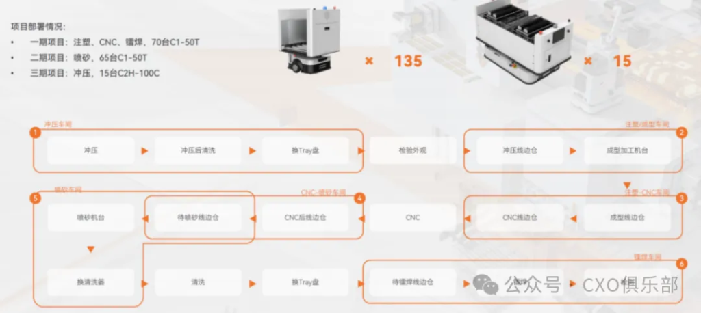 除此之外,在印刷电路板(PCB)行业中,也实施了一系列高效的案例。在某位于九江的上市PCB制造企业,我们安装了80多台移动机器人。第一阶段使用了64台机器人,用于搬运超过160个任务,跨越了16个公寓段和4层楼,实现了整个物流的自动化。通过数据分析,我们发现高频任务的移动距离相对较短且任务集中。针对此情况,进行了合理的布局规划,并关注不断变化的大范围场景运动和低频任务的周转。在第二阶段的工厂建设中,优化了底层连接和远距离配送,使运输任务主要集中在近距离范围内,减少了远距离任务对机台加工效率和使用时间的影响。通过这套方案,成功地实现了物流机器人与智能工厂之间的良好硬件和软件连接。 CXO UNION-CXO联盟(cxounion.cn)